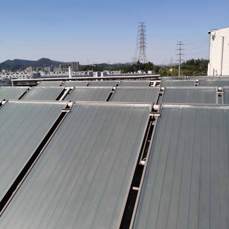 2:阳极氧化平板太阳能热水工程系统 1:太阳能热水工程原理 太阳能热水器是将太阳光照转化为热能,将水从低温加热到高温,以满足人们在生活、生产中的热水使用装置。太阳能热 水器由集热器、储水箱及相关附件组成,把太阳能转换成热能主要依靠集热器。集热器分平板式太阳热和真空管式太阳热两 种。其原理是集热器受阳光射面加温,利用热水上浮、冷水下沉的原理,使水产生微循环而达到所热水。 性能特点 * 太阳能水质洁净,清洁卫生,无污染,具排污净化功能。 * -次投资,长远受益,节省电费,燃料费,1-2年即可收回投资,受益时间长达15年。 * 太阳能集热器传热性能好,表面处理工艺高,吸热能力强。 * 系统保温性能好,蓄热能量大,热量损失少。 * 保温水箱有蓄水功能,可满足大量人员集中用热水,亦可做停水时应急水源之用。 * 系统安全可靠,全电脑自动控制,静态运动,无噪音,无污染,环保节能。 * 配套辅助加热方式,空气能,电能,各式工业余热,阴雨天可照常用热水。 * 保温水箱为双层304不锈钢,进口聚案脂整体发泡保温,保温层厚度大于50mm。 * 取热方式;自然循环或强制循环。 详细信息: 1、平板集热器设计标准 GB/T6424-2007《平板型太阳能集热器》 GB/T4271-2007《太阳集热器热性能实验方法》 GB/T19141-2003《家用太阳热水系统技术条件X》 欧盟EN12975 2、集热器技术说明 * 真空磁控溅射涂层,热吸收率290%+2,发射率s10%±2,是当前世界集热效率最高的太阳能吸热涂层 * 边框采用加厚型铝合金,保证产品使用寿命超过20年。同时设有专用防风连接件卡槽,确保了户外固定强度 侧/底保温均采用超细玻玻棉材料整体保热损系数更低,温性能更好 * 玻璃采用超白低铁布纹钢化玻璃,强度是普通玻璃的四倍,透光率达到91.5%以上。在保证集热效率的同时,充分考虑了集 热 器户外使用的安全 * 流道为TP2紫铜管,自动加压测试设备试验压力12Mpa,确保在系统中承压运行。 * 不锈钢支架或镀锌角钢。 |